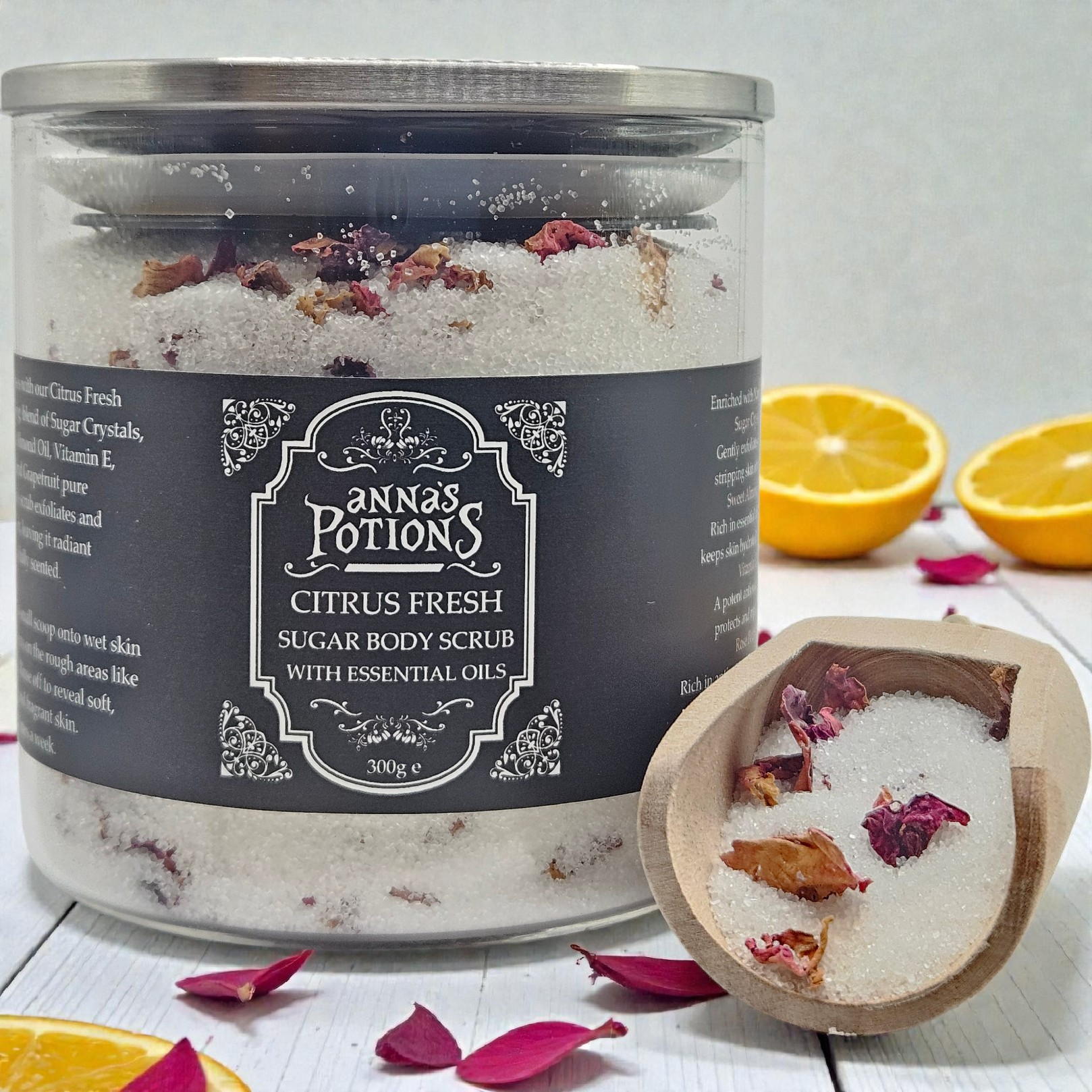 Ingredients: Sugar Crystals, Sweet Almond oil, Vitamin E, Rose petals, Orange & Grapefruit Essential oils.