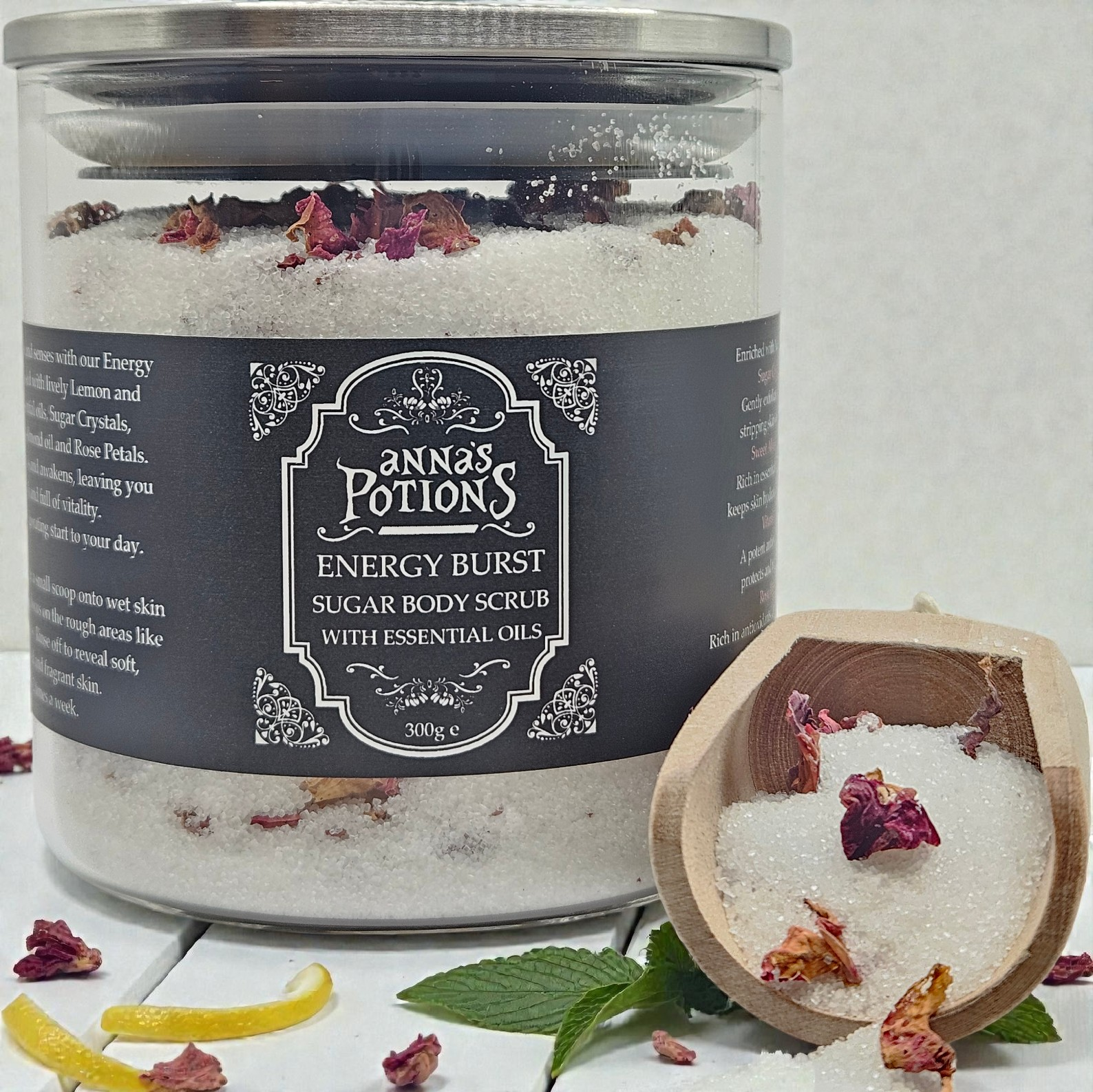 Recharge your skin and senses with our Energy Burst Sugar scrub. Infused with lively Lemon and Peppermint essential oils, Sugar crystals, Vitamin E, Sweet Almond oil and sprinkles of Rose petals. This scrub exfoliates and awakens, leaving you feeling fresh and full of vitality. Perfect for an invigorating start to your day.