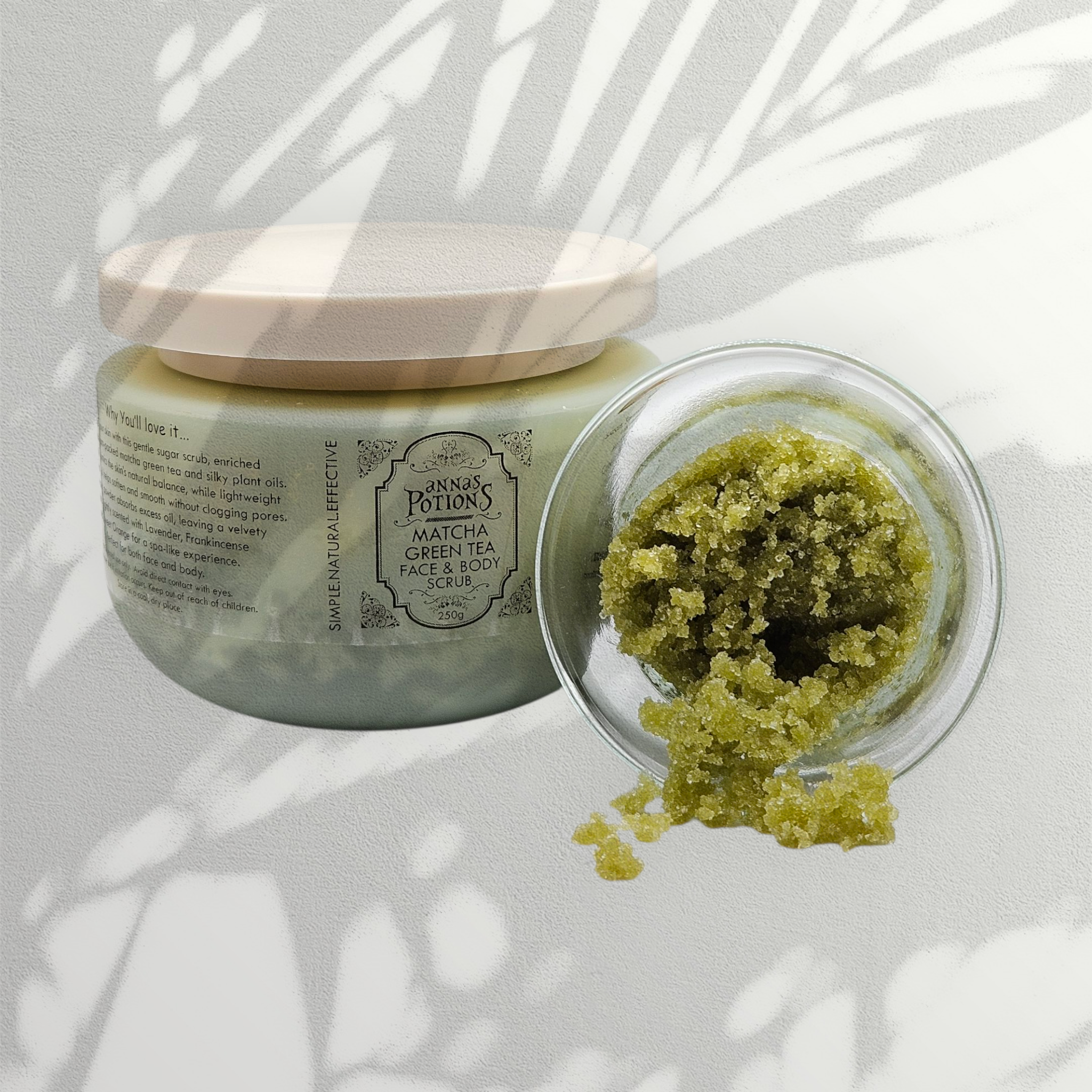 Ingredients: White Sugar crystals, Matcha Green Tea powder, Arrowroot powder, Jojoba and Grapeseed base oils, Vitamin E and pure Essential oils: Lavender, Frankincense, Sweet Orange.