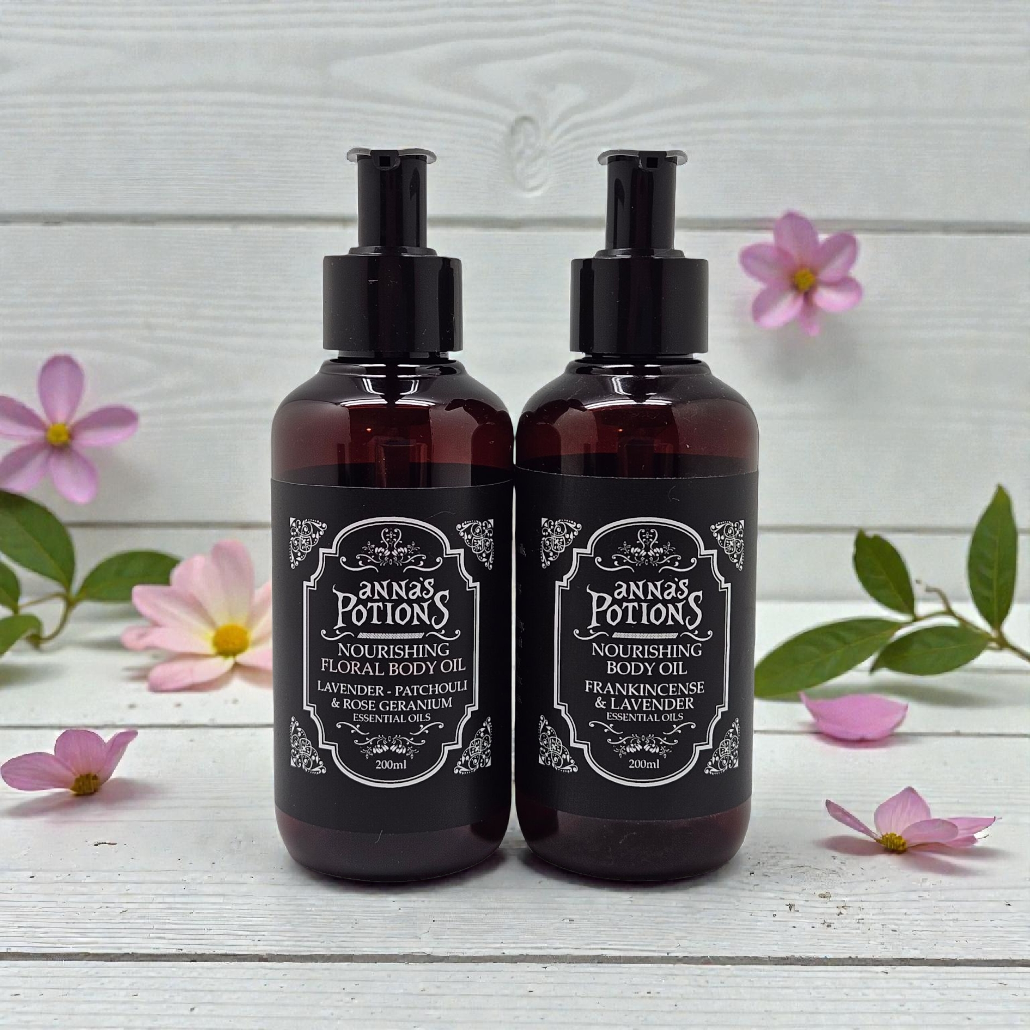 Nourishing Floral Body Oil ~ Crafted with pure essential oils of Lavender, Patchouli and Rose Geranium, renowned for their soothing floral and restorative properties and enriched with Vitamin E for added skin protection. Enriched with Grapeseed oil base for deep nourishment.